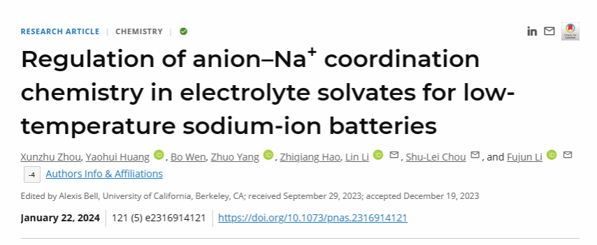 碳中和技术创新研究院李林团队联合南开大学李福军教授在国际权威期刊Proceedings of the National Academy of Sciences of the United States of America上发表题为“Regulation of Anion-Na+ Coordination Chemistry in Electrolyte Solvates for Low Temperature Sodium-Ion Batteries”的学术论文。文中选用高电子亲和能力的阴离子三氟乙酸根(TFA-)调控1.0 M NaPF6-G2电解液中的溶剂化学。该全氟阴离子的DN值高达34.0 kcal mol-1,其强配位作用使其全部参与内溶剂化鞘层,实现常规浓度下更多阴离子占据的溶剂化构型。与1.0 M NaPF6-G2电解液相比,增强的TFA-和降低的G2配位的溶剂化化学加速了界面Na+去溶剂化行为,呈现出较低的去溶剂化能(40至-20 ℃:3.49 vs. 4.16 kJ mol-1;-20至-60 ℃:16.55 vs. 24.74 kJ mol-1)。可诱导均匀稳定的Na沉积,实现25 ℃下500圈99.9%的超高超稳定的库仑效率。同时,Na||Na3V2(PO4)3电池在-40 ℃下循环呈现出60.2%的室温容量和100圈后99.2%的高容量保持率。这项工作为溶剂化化学调控助力高性能低温钠离子电池发展提供了新的见解。黑料社