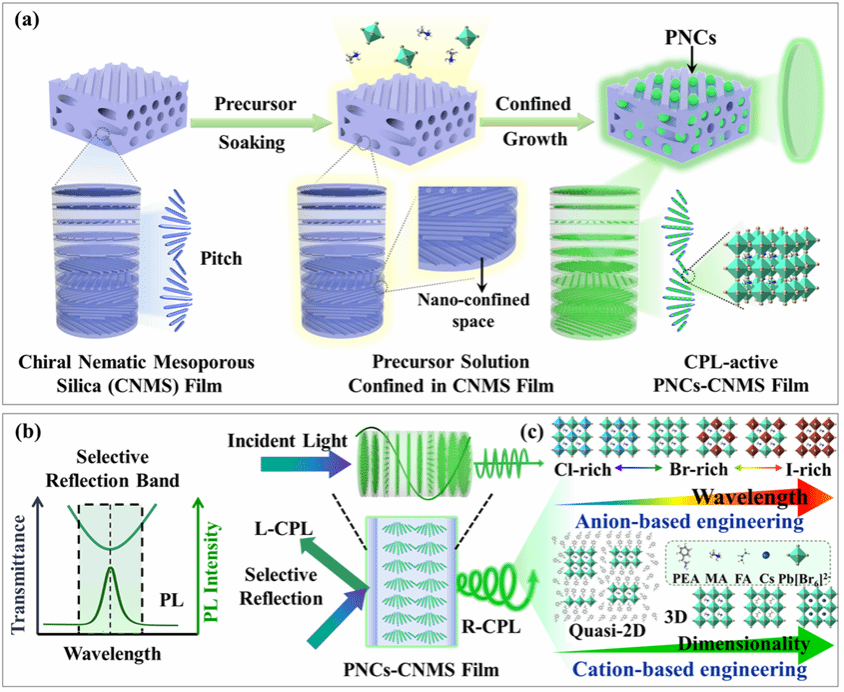 本文开发了一种简单但通用的受限生长策略,通过利用手性向列介孔二氧化硅(CNMS)薄膜作为主体和非手性PNC,生产具有全色可调性、高亮度、卓越稳定性和可定制成分的CPL活性PNC材料(即PNCs-CNMS)。CNMS模板可以赋予有吸引力的选择性反射、卓越的稳定性和有吸引力的通用性,同时PNCs保持其形状和依赖于成分的光学特性。通过对CNMS主体的光子带隙 (PBG)和PNC负载量的精细控制进而来定制CPL属性,|glum|值高达0.17,超过了固有的手性钙钛矿。值得注意的是,CNMS薄膜可以有效保护 PNC,有助于提高湿度、热稳定性和光稳定性。通过调节PNCs的卤素阴离子,可以获得一系列波长可调的CPL活性卤化物钙钛矿材料,实现全色发射。此外,这种总体策略使得能够在CNMS内制作具有不同组成(即A-/X-位点)和分子维度(即 3D 和 2D)的各种PNCs。重要的是,PNCs-CNMS薄膜内的可逆CPL切换可以通过利用CNMS模板的响应性或PNCs的动态特性来实现。为了进一步揭示其实际潜力,还展示了CP-LED器件中相应的集成潜力。该工作为制备高圆偏振光致发光材料提供了通用平台,在CPL相关应用中具有广阔的前景。