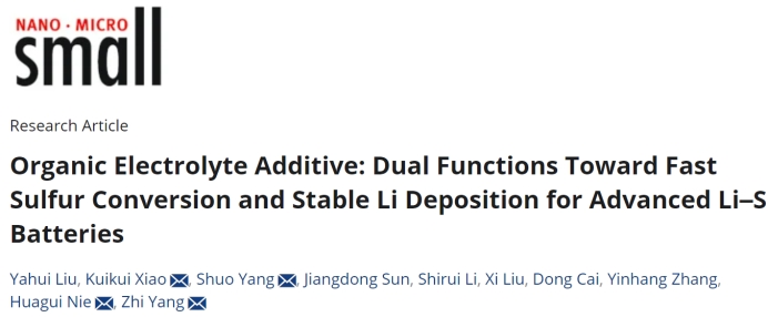 该研究以“Organic Electrolyte Additive: Dual Functions toward Fast Sulfur Conversion and Stable Li Deposition for Advanced Li–S Batteries”为题发表在国际顶级学术期刊《Small》。黑料社