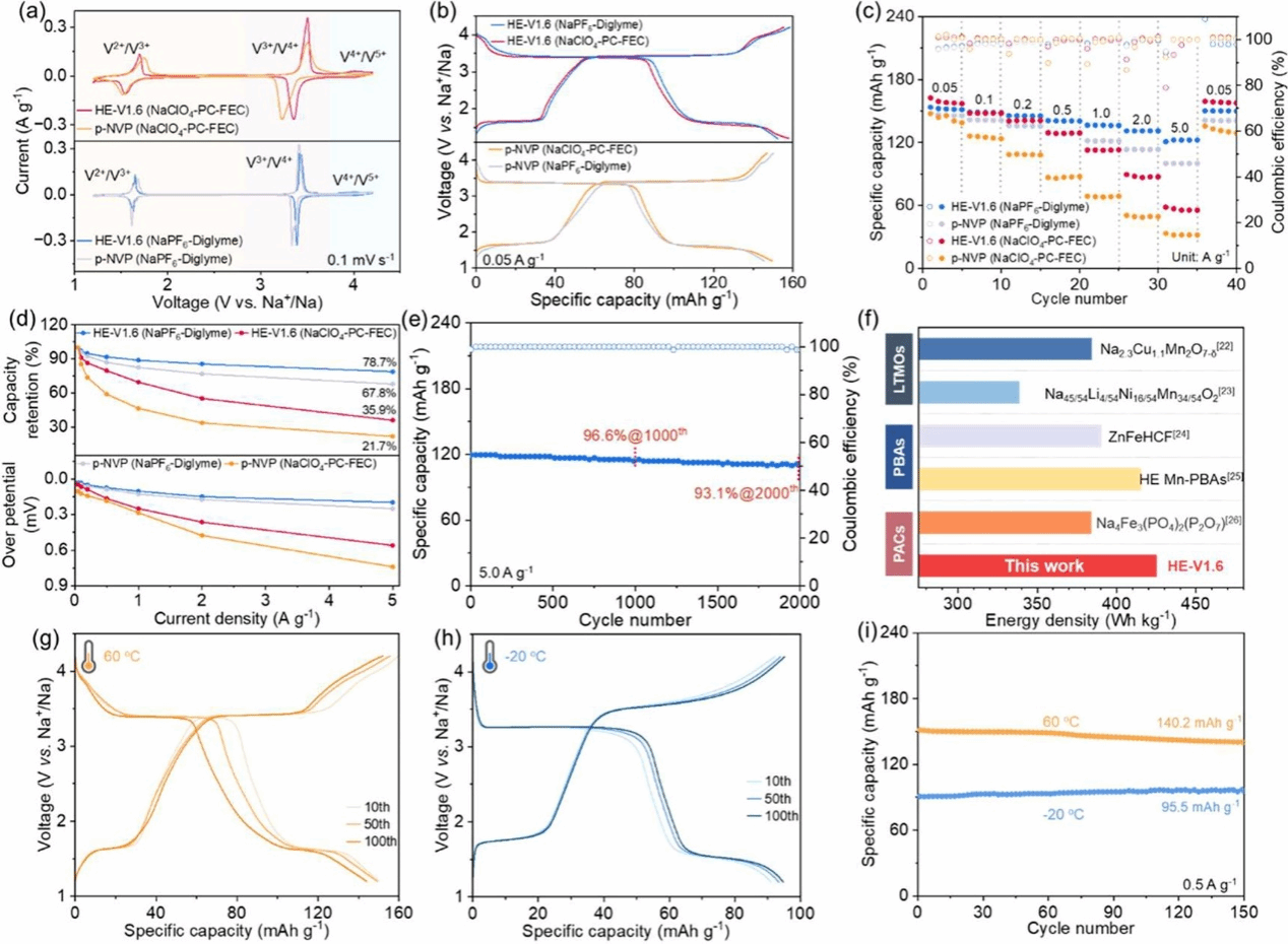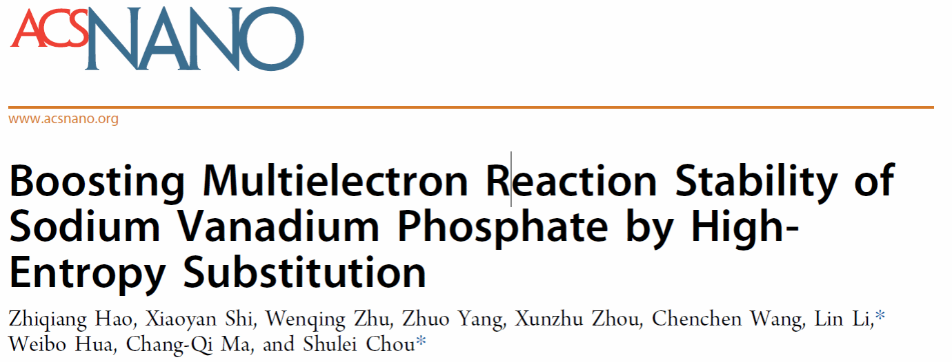 碳中和技术创新研究院李林团队在国际权威期刊ACS Nano上发表题为“Boosting Multielectron Reaction Stability of Sodium Vanadium Phosphate by High Entropy Substitution”的学术论文。本文提出了一种结合高熵取代和电解液优化的策略来促进NVP的可逆多电子反应。通过原位X射线吸收近边结构光谱和原位X射线衍射,揭示了V5+/V4+氧化还原对的高可逆性和可逆晶体结构演变。同时,通过使用醚类电解液可以进一步提升高熵取代NVP(HE-NVP)的电化学反应动力学。这使得HE-NVP表现出优越的电化学性能(2000次循环后容量率为93.1%)。即使在5.0 A g−1时,可逆容量也为120 mAh g−1)。此外,HE-NVP||天然石墨全电池液展现出长循环寿命和高功率密度。结果表明,高熵取代和电解液优化的协同是提高聚阴离子正极钠存储性能的有力策略。黑料社
