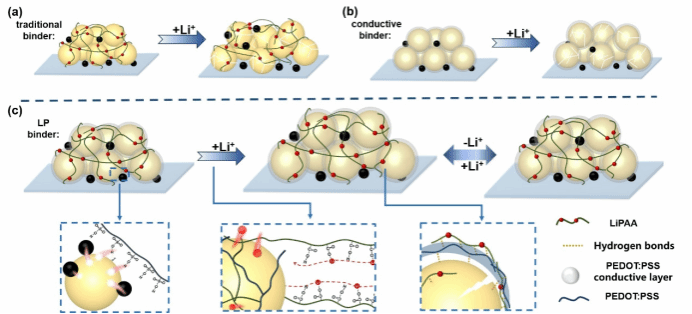 图1. 不同粘结剂在硅电极中的作用机理示意图。