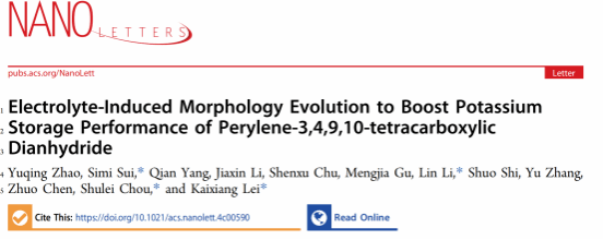 碳中和技术创新研究院李林团队联合河北工业大学雷凯翔副教授在国际权威期刊Nano Letters上发表题为“Electrolyte-Induced Morphology Evolution to Boost Potassium Storage Performance of Perylene-3,4,9,10-tetracarboxylic Dianhydride”的学术论文。文中提出了一种用于有机材料的弱溶剂化电解液,并揭示了电解液对电化学性能的影响机理。电解液不仅表现出较低的溶解能力,而且在充放电过程中诱导了PTCDA的形貌演变。独特的纳米线形貌提高了电化学反应动力学,抑制了PTCDA的溶解。在2000次循环后实现89.1%的高容量保持率。同时,石墨||PTCDA全电池具有卓越的循环稳定性能,展现出强大的实际应用潜力。这项工作提出了一种新颖的解决有机物高溶解问题的思路,为电极材料形貌演变的研究提供了理论基础。黑料社