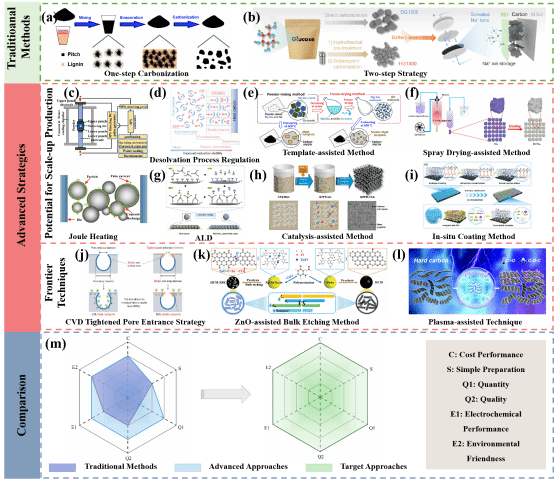 碳中和技术创新研究院吴星樵博士团队将目前报道的实验室先进合成硬碳材料的方法进行了综述,包括具有规模化潜力和更偏向理论指导意义的两种,与传统方法(目前的规模化制备方法)进行对比,从预处理、高温碳化以及后处理的角度介绍了提升硬碳材料性能/能量利用效率的先进方法,并对硬碳负极材料实验室制备到实现商业化应用进行了展望。