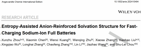 碳中和技术创新研究院李林团队联合安徽大学张朝峰在国际权威期刊Angew. Chem. Int. Ed.上发表题为《Entropy-Assisted Anion-Reinforced Solvation Structure for Fast-Charging Sodium-Ion Full Batteries》的学术论文。本文提出了一种具有阴离子增强型溶剂化结构和高离子电导率的混合酯醚电解液,诱导阴离子衍生的坚固电极-电解液界面的形成。将弱溶剂化的醚基溶剂四氢呋喃(THF)引入到碳酸丙烯酯(PC)基电解液中,记为1.0 M NaPF6-PC/THF,调节更多的PF6-阴离子参与到Na+内鞘中,加速脱溶过程。此外,由熵效应引起的分子多样性增加的弱溶剂化结构可以增强离子电导率和快速的界面动力学。18650圆柱PB||HC全电池在100次循环后容量保持率为82.5%。这项工作强调了熵辅助的混合酯醚电解液在高性能钠离子电池中的潜力。黑料社相关的文章发表在Angew. Chem. Int. Ed.上,黑料社