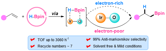 其次,他们创新性地提出了一种通过控制Ir SA催化剂中Ir-O配位键的电子构型来显著提高烯烃硼氢化反应的有效的策略。通过Ni2+空位缺陷的稳定作用,在形貌和尺寸相近的Ni(OH)x和NiOx载体上构建了两种具有Ir-O配位键的Ir SA催化剂。一系列表征证明了Ir1/Ni(OH)x中的Ir-O配位键与Ir1/NiOx相比具有更低的电子密度,因此其氧化性更强。研究发现,在无溶剂条件下的烯烃反马氏硼氢化反应中,具有贫电子特性的Ir-O配位键使得Ir1/Ni(OH)x能够在温和的条件(环境温度、Air、20 min)达到3060 h-1的优异转化频率(TOF)值,是Ir1/NiOx的72倍,远远优于传统的多相Ir纳米催化剂和均相Ir催化剂。结合机理研究和化学计算分析进一步揭示了Ir1/Ni(OH)x优异的活性源于其中存在的贫电子Ir-O配位键的强氧化作用,可使H-B(OR)2的B-H键更有效地断裂,从而使烯烃的硼氢化反应以更低的能垒顺利进行。这项工作将为改变SA催化剂中配位键的性质以优化其性能提供新的线索,并为开发出性能更好的异相催化剂以用于均相有机反应的异相化提供思路。此项工作以《Electron Deficient Ir-O Bonds Promote Heterogeneous Ir-Catalyzed Anti-Markovnikov Hydroboration of Alkenes under Mild Neat Conditions》为题发表在《Nano Letters》上,黑料社