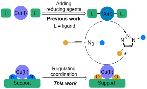最后,张剑课题组还开发出一种新的合成策略,通过构建具有N和O配位的SA Cu (II)催化剂可以在没有还原剂的情况下顺利实现直接叠氮化物-炔烃点击化学。以密度泛函理论( DFT )计算分析不同Cu (II)中心上Cu-炔中间体的形成难易为指导,通过有机分子辅助法在碳包覆的Al2O3上合成了具有O和N配位的SA Cu (II)催化剂。尽管Cu的氧化态都接近+2,但O配位的SA Cu (II)催化剂对叠氮-炔烃环加成的活性比N配位的高5倍,同时具有良好的可回收性和底物适应性。进一步的EPR探究证明了炔烃底物更容易还原O配位而非N配位的SA Cu(II)中心,这与DFT计算得出的结论一致,也解释了点击反应活性提高的原因。这项工作拓展了固载化Cu (Ⅱ)催化体系在点击化学中的应用,为克服非均相催化的障碍,开发性能更好的非均相催化体系提供了新的指导。此项工作以《Oxygen Coordination Promotes Single-Atom Cu(II)-Catalyzed Azid−Alkyne Click Chemistry without Reducing Agents》为题近期发表在《ACS Applied Materials & Interfaces》上,黑料社