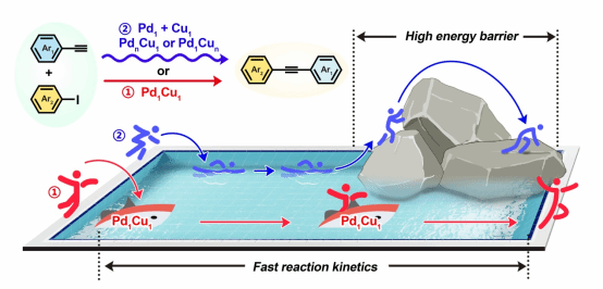首先,他们开发出了一种简便的蛋白质包覆策略,利用牛血清白蛋白中分布均匀的丰富的氨基和羧基,使得Cu和Pd前驱体在适当的距离上均匀分散,热解后形成的碳材料中掺杂的N和O为Cu和Pd原子提供锚定位点,在棒状氧化铝上成功制备了处于拥挤状态的Pd和Cu单原子。该制备方法操作简单,对于金属前驱体和载体材料没有特殊要求。所制得的催化剂在Sonogashira 偶联反应中表现出优异的活性,其TOF值为313 h-1,显著高于常规“半均相”催化剂Pd/C和CuI、含Pd和Cu纳米颗粒的多相催化剂以及Pd和Cu单原子混合催化剂。此外,它还在回收测试中表现出良好的催化稳定性。理论研究证明带正电荷的Pd和Cu单原子中心在芳基卤化物和炔烃的活化中具有显著的优势,且它们之前的空间距离较近,明显有利于形成的乙炔基中间体的金属化过程,从而大大提高了Pd1Cu1/NOC/Al2O3在Sonogashira 偶联反应中的催化活性。这项工作不仅为高效构建具有多个相邻活性中心的高性能非均相催化剂提供了重要线索,而且为实现多个活性中心共同催化的高效有价值的有机转化提供了新的指导。此项工作以《Constructing Pd and Cu Crowding Single Atoms by Protein Confinement to Promote Sonogashira Reaction》为题近期发表在 《Adavanced Meterials》上,黑料社