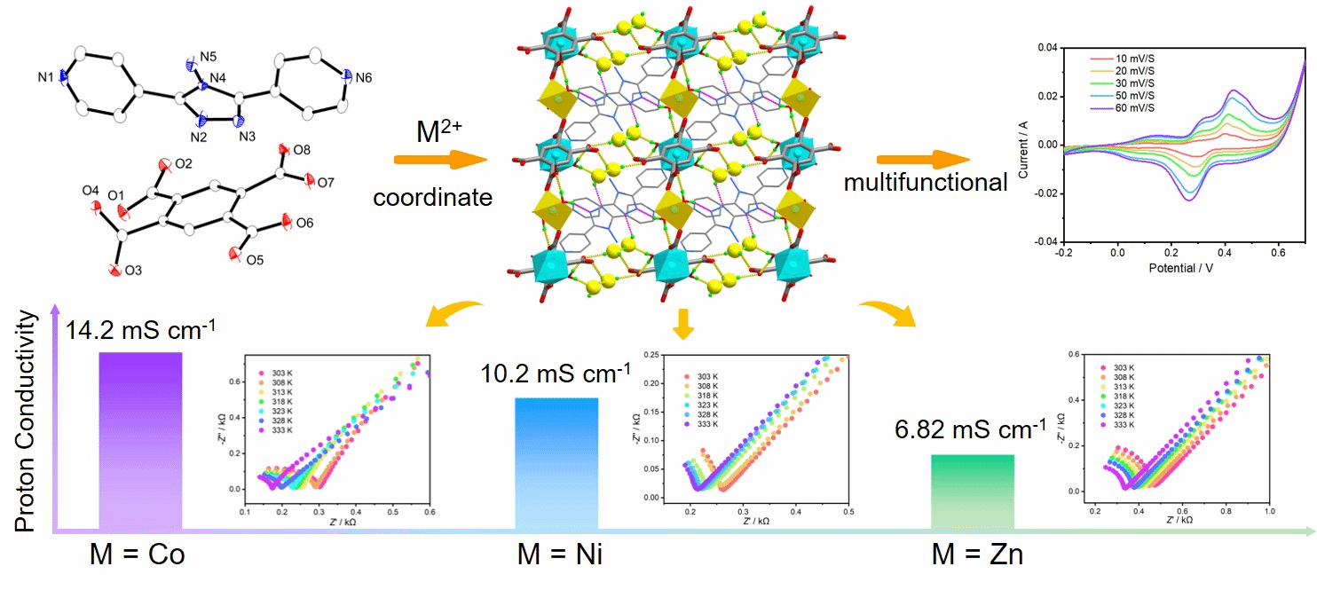 随着石油、煤炭等不可再生资源的不断减少,以及环境污染问题的日益严重,迫切需要开发新的、清洁的、可再生的能源材料。质子交换膜燃料电池(PEMFC)具有高能量密度、无污染运行、快速启动以及易于安装和操作的优点,作为清洁能源受到人们的广泛关注。质子交换膜是确保PEMFC安全高效运行的关键部件,在其使用寿命中起着决定性作用。开发具有卓越导电性和优异稳定性的质子传导材料一直是人们所期望的。金属-有机骨架(MOFs)的结构可设计性、可调节的功能和丰富的主客交互作用,有利于构建广泛的氢键网络以进行质子传输,可作为新型固体电解质应用于质子交换膜。与此同时,MOFs也被认为是开发多功能材料的良好平台。通过在单相材料中引入两种或两种以上不同的功能单元,可以扩展其应用范围,以执行各种任务。超级电容器(SCs)作为MOF在电化学领域的另一个重要应用,因其高功率密度、快速充放电速率和优异的循环稳定性而备受关注。然而,直接利用MOFs作为创新型电极材料的研究相对缺乏,其在SCs储能应用的潜力正在接受评估。在此背景下,设计和构建新型质子导电MOFs并探索其作为SCs电极材料的潜力具有重要的意义。