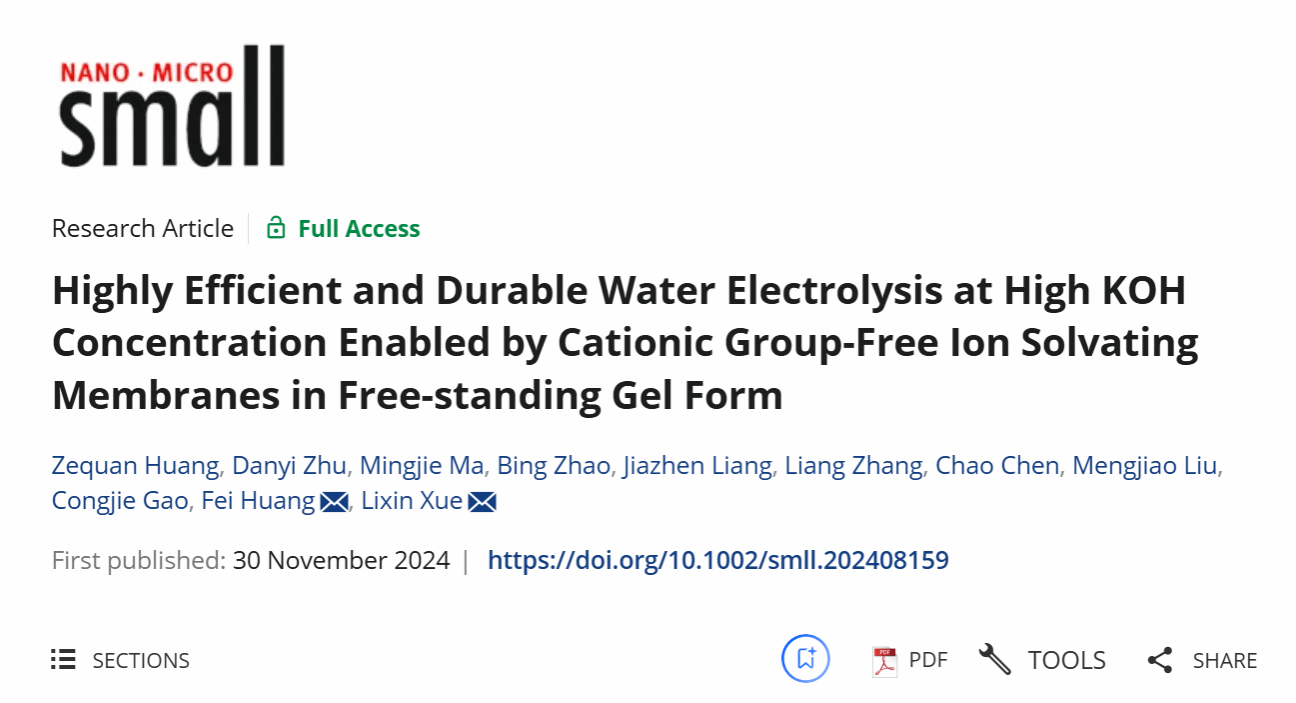 薛立新研究员与浙江工业大学黄菲教授合作团队在国际知名的期刊 Small上发表题为“Highly Efficient and Durable Water Electrolysis at High KOH Concentration Enabled by Cationic Group-Free Ion Solvating Membranes in Free-standing Gel Form”的研究论文。该工作提出了一类新型的独立式凝胶形式的无阳离子基团的离子溶剂化膜 (ISM-PBI-FG) 用于高效和耐用的碱性水电解。该膜以凝胶形态存在,通过溶胶-凝胶转变过程后经KOH吸收制备而成。与传统的 AEM 和PBI基 ISM 相比,ISM-PBI-FG 膜具有多孔的内部结构和致密的外表面,为碱性电解质的吸收提供了更大的体积,并为离子传输创造了纳米级通道。ISM-PBI-FG膜是由纠缠的聚苯并咪唑(PBI)纳米纤维组成的3D多孔微观结构,实现了89%的孔隙率,使其能够吸收极高的碱液(在6 M KOH中为346%)并展现出卓越的离子传导性(在80°C时为763 mS cm⁻¹)。这一概念的可行性通过 AWE 测试得到了验证,其中使用 NiFe/Raney Ni(不含 PGM)和 NiFe/Pt/C (PGM) 催化剂组合,在 2.0V 下电流密度分别达 2.2 A cm-² 和 5.5 A cm-²,实现了优异的水电解性能。本研究工作得到国家自然科学基金委基金项目(22209147)和中国工程院院士咨询项目(2022-DZ-08)的资助完成。