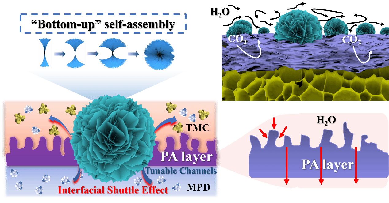 薛立新研究员联合浙江工业大学黄菲教授开发了一种基于自组装纳米花(P(AA-I)-NFs)的薄膜纳米复合(TFN)全热交换膜。研究中,通过精准调控纳米花的层内与层间孔道,提出了一种全新的界面聚合策略,引入“界面穿梭效应”来优化聚合反应深度和活性层形貌。与传统聚酰胺薄膜相比,该膜显著提高了表面粗糙度和厚度,展现出更优异的水汽渗透性(656.59 GPU)、焓交换效率(71.47%)和CO₂阻隔性能(0.51 GPU)。这项研究成果突破了传统材料的性能权衡,为下一代高效节能新风系统关键膜材料研发的提供新思路。