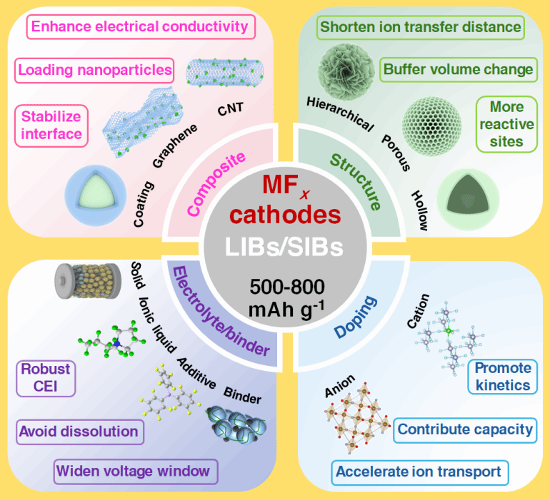王舜教授和赵世强副教授研究团队基于文献调研和课题组研究基础,总结提出了增强MFx正极性能的四种理性策略,深入剖析了四种策略的实现方法、作用机制和基本原理,并对MFx正极的结构组成设计、电解液匹配、综合性能增效、储能机理探究等理论及应用研究提出了展望。