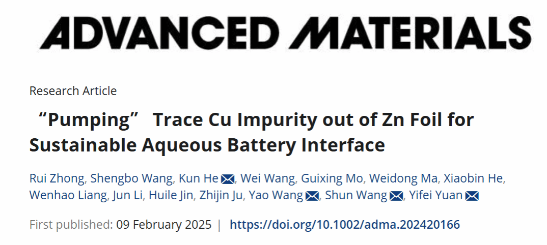 相关研究成果以“‘Pumping’ Trace Cu Impurity out of Zn Foil for Sustainable Aqueous Battery Interface”为题发表在国际顶级期刊《Advanced Materials》。黑料社