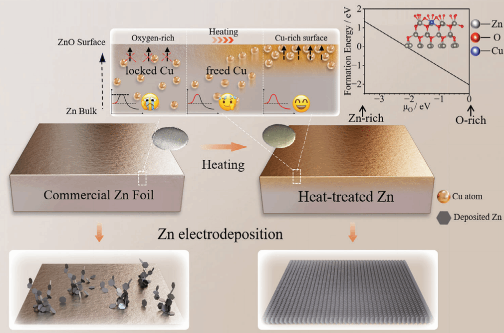 王舜教授和袁一斐教授研究团队提出一种全新的界面改性策略,即通过直接对购买来的锌箔(保留表面氧化层)进行加热处理,以此激活锌箔内部的铜原子,并使其向表面扩散,最终成功在锌箔表面制备出富铜保护层。团队成员利用先进的3D原位光学显微镜分析,发现在所构造的富铜层影响下,电极表面的电沉积锌过程是致密、均匀且无枝晶生成的。并且,借助激光共聚焦光学显微镜、晶体学建模以及理论计算结果,揭示了在新构建的富铜表面上发生的是具有(101)取向的锌电沉积过程,这与传统报道的(002)取向电沉积机制形成鲜明对比。此外,电化学测试进一步表明,改性后的锌负极性能得到显著提升。
