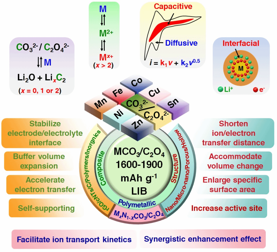 探索先进电极材料的结构组成设计规律、性能增强机制和能量存储机理是高性能电池开发的关键。为了显著提升锂离子电池(LIB)的续航能力,开发高容量负极材料被认为是高效策略之一。过渡金属碳酸盐/草酸盐(MCO3/MC2O4,M = Mn、Fe、Co、Ni、Cu等)作为LIB负极材料因其高容量(1600-1900 mAh g-1,是商用石墨负极的4~5倍)、低成本、易制备及资源丰富等优势备受关注。然而,常规方法合成的MCO3/MC2O4通常为较大的块体状颗粒,存在体积膨胀率高和电荷传输动力学迟缓等固有缺陷,导致电池循环性能和倍率性能不佳。此外,基于传统认知的反应机理MCO3 + 2Li+ + 2e- ⇌ M + Li2CO3与MC2O4 + 2Li+ + 2e- ⇌ M + Li2C2O4,其理论容量分别仅为~460和370 mAh g-1,远低于其实际容量,暗示MCO3/MC2O4存在新颖的储能机理尚待揭示。