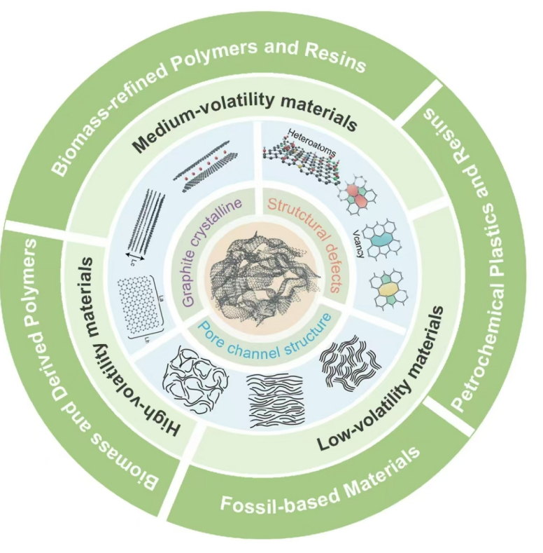 侴术雷、吴星樵团队联合上海大学李丽教授综述了前驱体选择的重要作用,并基于挥发分含量提出了前驱体分类体系。高挥发性生物质前驱体(如竹子)通常需要经过酸/碱浸或水热等预处理,以优化热解过程;中等挥发性的树脂和塑料则可通过交联策略提升性能;而低挥发性的材料(如生物炭、石油焦)则依赖纳米通道工程以改善钠储存性能。竹基前驱体因其可再生性与环境友好性被认为是极具前景的方向,但在杂质控制、结构调控等方面仍存在挑战。本文强调将前驱体设计与碳化策略相融合,提出了调控硬碳微观结构与提升其电化学性能的综合框架。相关研究成果为实现高性能硬碳材料的规模化、可持续制备提供了重要理论指导,为下一代钠离子电池技术的发展奠定了基础。