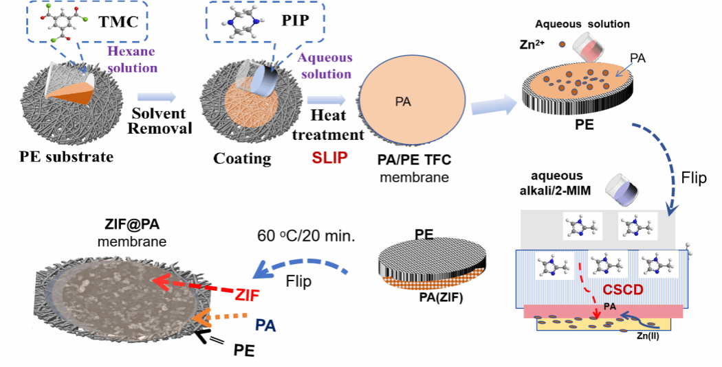 薛立新研究员,在国际知名的期刊 Materials Science for Energy Technologies上发表题为“Superior polyethylene based total heat exchange membranes made from sealing polyamide separating layers with in situ grown ZIF-8 particles”的研究论文。该研究为了提高聚酰胺(PA)/聚乙烯(PE)基薄膜复合材料(TFC)全热交换膜(THEMS)的性能,开发了Zn(II)溶液和2-甲基咪唑(2-MIM)-氨溶液(pH=10)之间的跨基底反向扩散(CSCD)过程,原位生长ZIF-8颗粒。来自CSCD工艺的原位生长的ZIF颗粒通过密封缺陷点有效地阻止了穿过PA分离层的CO2泄漏,并提供了选择性的水蒸气渗透通道和表面积以提高能量回收效率。系统研究了Zn(II)负载量、CSCD反应时间和配体种类对材料结构、CO2阻隔性能和热交换效率的影响。在优化条件下,ZIF-8颗粒封孔可使CO2渗透率从7.5GPU降低到1.15GPU,显热、潜热和热交换效率分别从80%、53%、68%提高到96%、73%和82%。