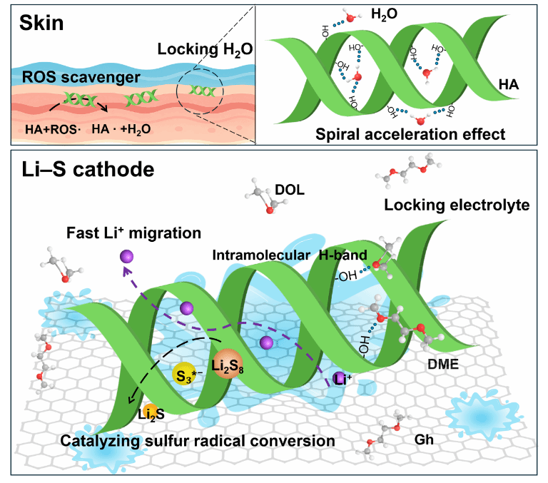 杨植教授、杨硕副教授与济南大学刘浩博士合作,提出一种创新性策略:将天然保湿材料——透明质酸HA作为催化剂引入硫阴极,实现高性能锂硫电池。实验和分子动力学模拟结果表明,HA可以通过其双螺旋结构中的分子内氢键牢牢的吸附电解液,确保电解液与电极表面充分接触,营造局部电解液充足的反应微环境;同时,HA的N位点能够吸附并催化多硫化物的可逆转化;此外,HA独特的双螺旋结构凭借螺旋加速效应促进了Li+的传输。在三重协同作用下,电池性能得到显著提高。CNT−S/HA阴极(约80 wt%硫含量)表现出良好的初始容量、高倍率性能以及长循环寿命。特别是在硫负载为8 mg cm−2、E/S比为3 μL mg−1的贫电解液条件下,锂硫软包电池实现了11.76 mAh cm−2的高面积容量,能量密度达到409 Wh kg−1。此外,1.5 Ah软包电池可驱动无人机续航20分钟,续航时间远超传统锂电池约4倍。该工作为开发天然保湿材料在下一代储能设备中的应用开辟了创新途径。