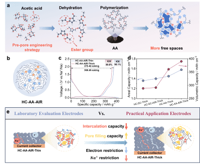吴星樵/侴术雷联合浙江大学范修林提出了一种硬碳负极的多尺度孔调控策略,有效解决了兼顾高比容量与高体积容量这一长期存在的难题。实验数据与理论计算表明,在水热过程中,乙酸改变了水热炭的疏水性,促进了分散性球形颗粒的形成,并提升了材料的压实密度。预孔工程策略可增加水热炭的自由体积与开放孔结构:其中,酯化反应形成的自由体积有利于最终硬碳中封闭孔结构的构建,而氧化刻蚀产生的开放孔则便于硬碳后续形成微孔结构。得益于对硬碳材料微观与介观尺度的双重调控,该材料展现出优异的电化学性能,其可逆容量达 375.40 mAh/g,首次库伦效率达 90.10%。当厚电极受到更高压实处理时,其球形形貌使其仍能保持较高的克容量(359.49 mAh/g),同时体积比容量得到提升(390.30 mAh/cm³)。与普鲁士蓝正极组装成扣式全电池时,电池能量密度高达 318.44 Wh/kg。值得注意的是,在宏观层面阐明了在低电位下,实验室规模与实际应用级电极中钠嵌入及孔填充过程背后的机制,为开发高能量密度钠离子电池提供了宝贵指导。该研究成果以" High-Compaction Spherical Carbon with Tunable Rich Pore Structures for Efficient Sodium Storage"为题,发表在国际顶级期刊《Advanced Materials》上。黑料社