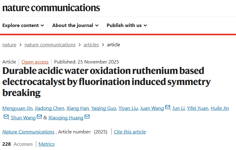 王娟/金辉乐/王舜团队在国际顶级期刊《Nature Communications》发表题为“Durable acidic water oxidation ruthenium based electrocatalyst by fluorination induced symmetry breaking”的论文。在这项工作中,通过DFT计算预测了一种高效酸性OER电催化剂,该催化剂通过F取代RuO2中部分O原子来打破八面体构型的对称性,从而实现反应路径的切换。其中,对氧物种吸附能力的改善和脱金属过程的削弱,显著提升了催化剂的OER本征活性和抗溶解能力。实验表明,在酸性条件下,F–RuO2/FC仅需192、243和296 mV过电位即可分别达到10、50和100 mA cm–2的电流密度。更重要的是,在PEMWE中,1.58、1.70、1.89和2.05 V的电压可分别驱动500、1000、2000和3000 mA cm–2的电流密度,并能在100、500及1000 mA cm–2的电流密度下持续稳定运行两个月。原位实验证实,F诱导的对称性破缺确保了RuO2在OER过程中的结构稳定性,并将其反应机制从传统的LOM转变为AEM,从而显著增强了稳定性。