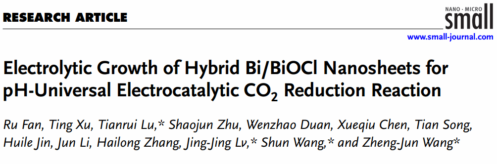 该成果以“Electrolytic growth of hybrid Bi/BiOCl nanosheets for pH-universal electrocatalytic CO2 reduction reaction”为题发表在Small期刊(IF=12.1)上。黑料社