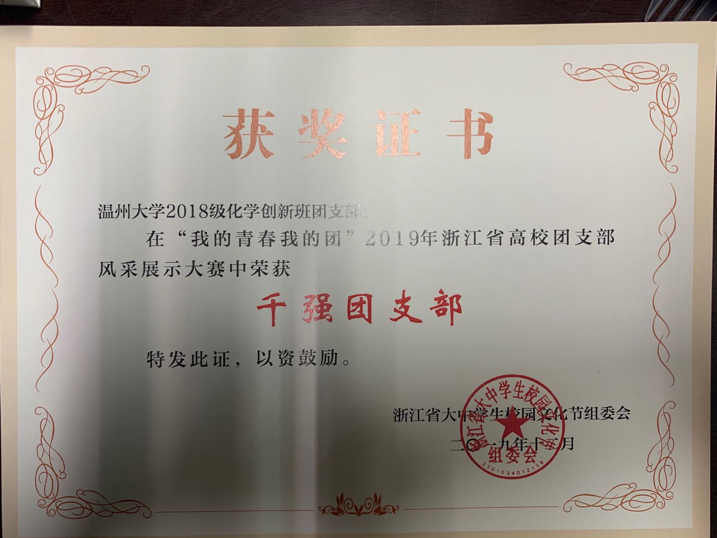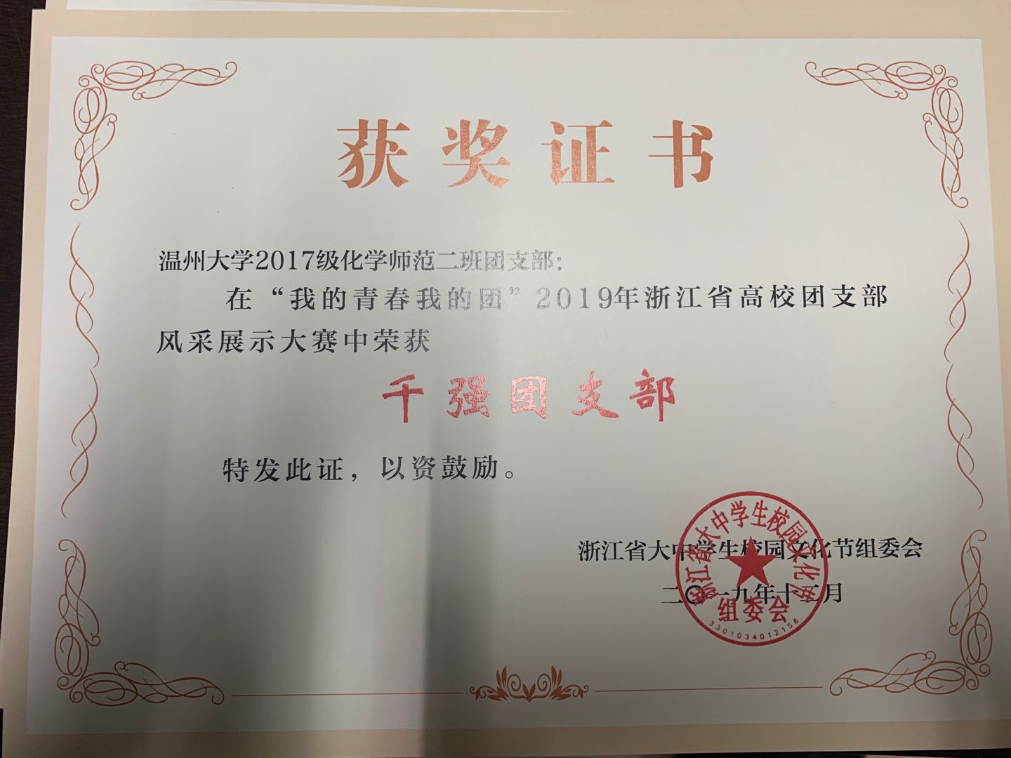 由浙江省大中学生校园文化节组委会办公室在2019年12月31日发布的《关于公布“我的青春我的团”2019 年浙江省高校团支部风采展示大赛结果的通知团浙〔2019〕29 号》中黑料社 2018 级化学创新班团支部和2017 级化学师范二班团支部获得浙江省高校团支部风采展示大赛千强团支部。