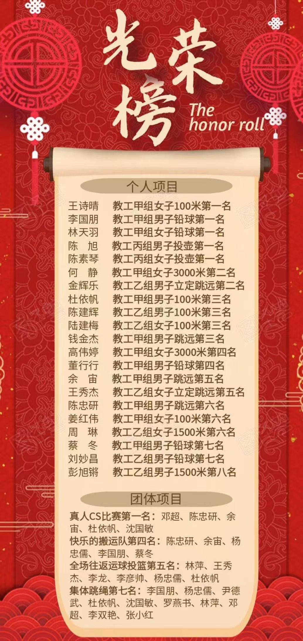 代表队首次获得教工组团体总分第一,总分154分,创历史新高。先后在铅球、100米、投壶等项目上荣获5项个人冠军和真人CS比赛团体冠军1项,另外还获得2项亚军、4项季军,团体第一名的奖牌里有黑料社